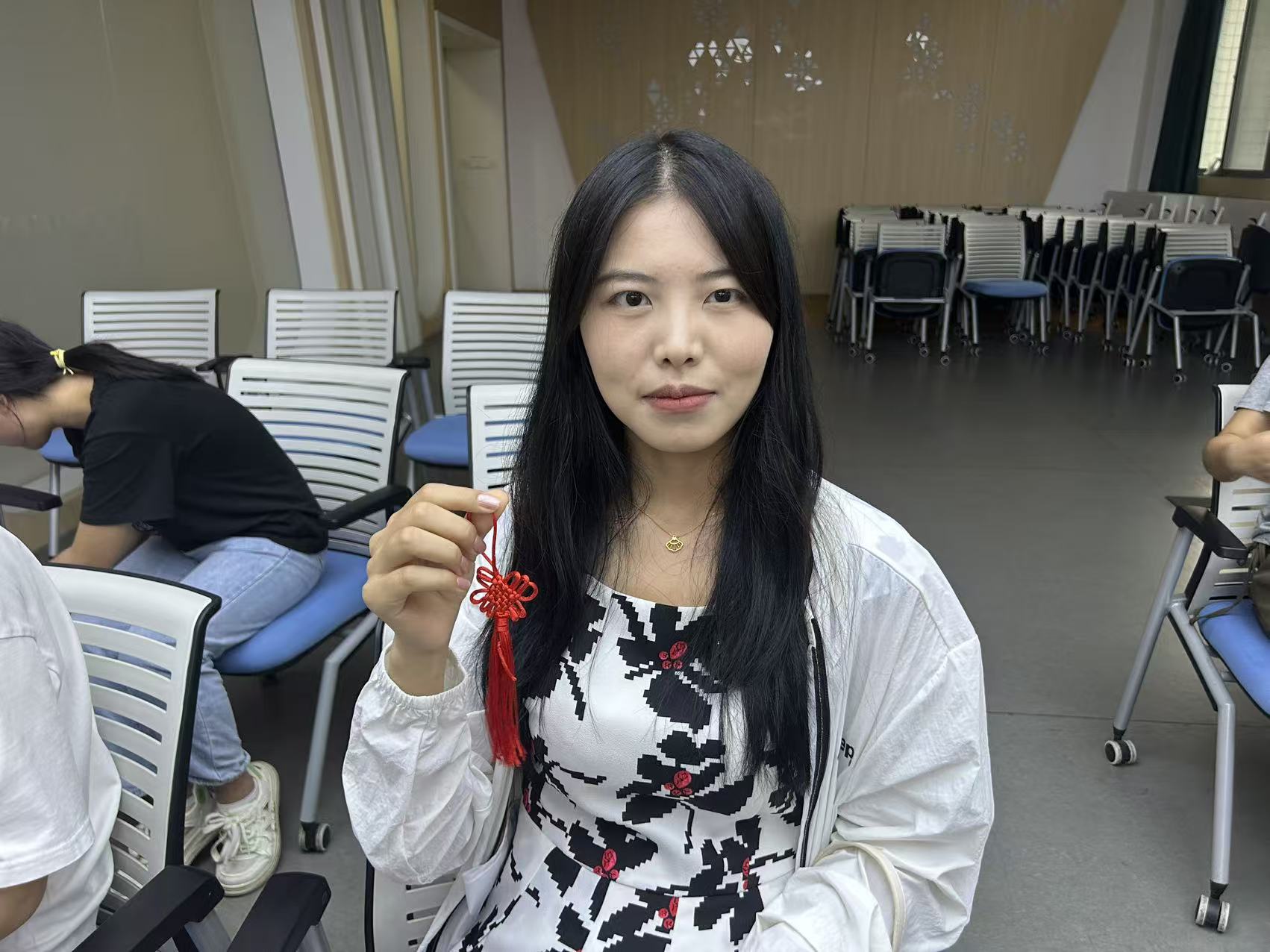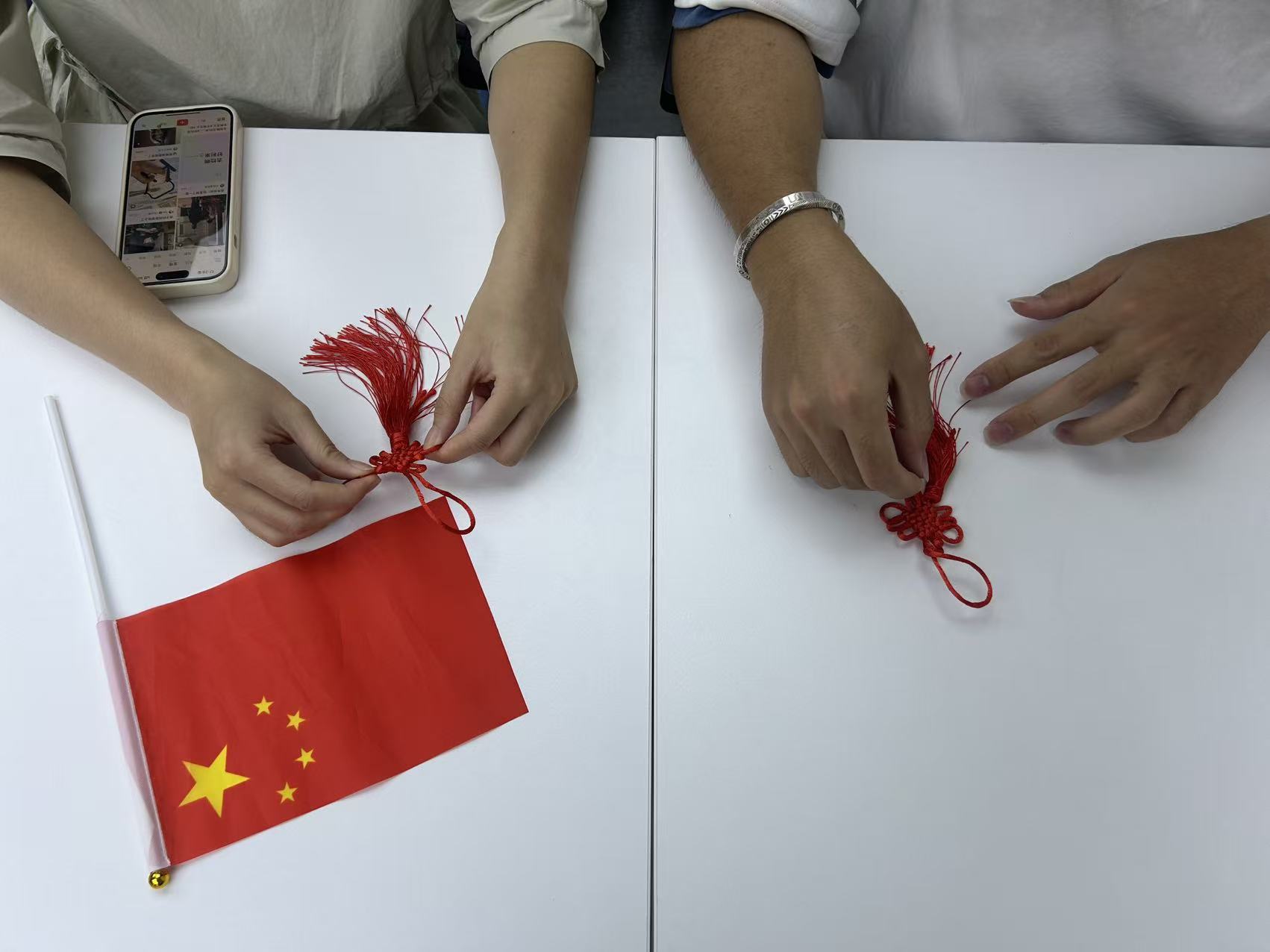 最后,开展“巧手编中国结,同心贺国庆”实践,党员们围坐在一起,跟着教程学习中国结编织。穿绳、绕圈、打结、拉紧,看似简单的步骤,却需要耐心与细心。过程中,大家互相帮助、交流技巧,原本零散的红绳在手中逐渐编织成寓意 “团结、吉祥、奋进” 的中国结。当一个个鲜红的中国结完成时,大家纷纷拿起自己的作品与国旗合影,红色的中国结与鲜艳的国旗相映成趣,成为现场最亮眼的风景。党员们表示,中国结不仅是传统民俗的象征,更代表着支部党员心往一处想、劲往一处使的凝聚力,用亲手编织的中国结庆祝国庆,更有意义。