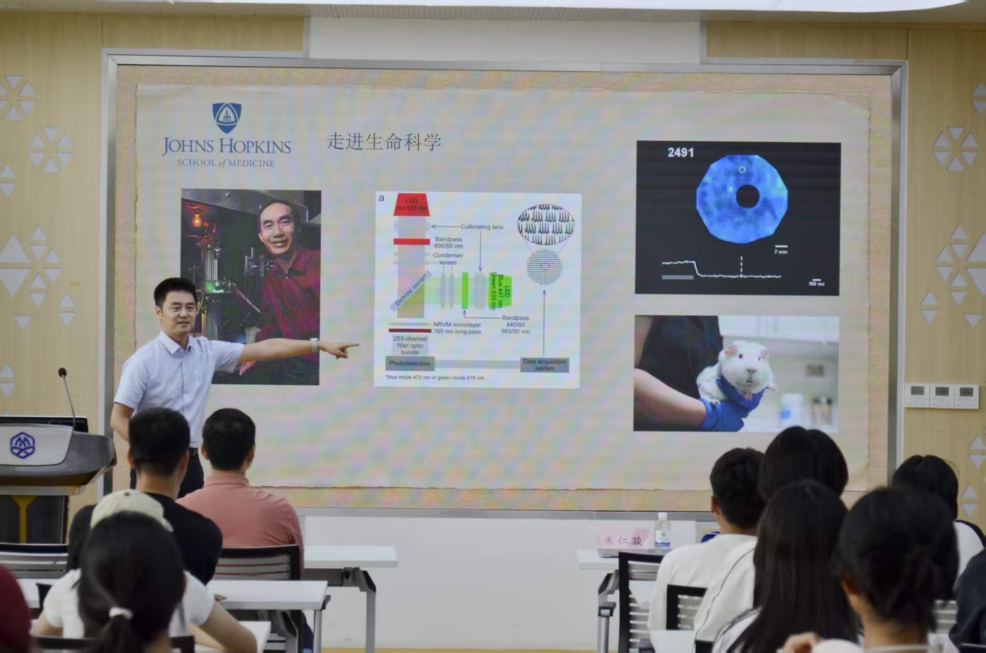 分享环节,朱仁骏以“没想清楚没关系,重要的是在路上”为主题,分享了自己在清华大学、美国约翰斯霍普金斯大学的求学故事。他从自身专业生物医学工程出发,介绍了学科的基本情况,围绕在清华的学习经历,建议大家本科期间可以接触不同领域知识,找寻自身感兴趣的方向。接着,他围绕“走进生命科学”讲述了自己在美国约翰斯霍普金斯大学的求学之旅,从自身的课题选择过程到实验经历,向同学们介绍了自己作为科研人的学习历程。其中,在讲解细胞培养研究中,他通过动画演示与细胞图像展示向大家讲解了心肌细胞的诱导与培养,并强调了团队协作的重要性。最后,他分享了归国后的工作故事。从求学故事到工作生活,他以亲身经历启示同学们:坚持选择,坚持热爱,将决策做成正确。