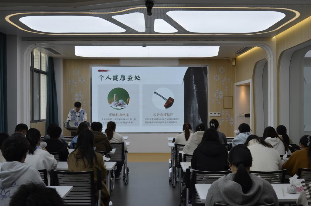活动以“艾草文化”为核心,学生会权益服务部李龙祺现场讲解了艾草的文化底蕴与实用价值:从追溯其源远流长的历史脉络,到阐释不同时期的发展演变;从解析促进血液循环、缓解肌肉疲劳等多重功效,到明确其对年轻人颈肩不适、中老年人关节疼痛等问题的适配场景;随后同步视频分步拆解制作流程,细致指导艾草甄选、填料压实、缝线固定等关键步骤。