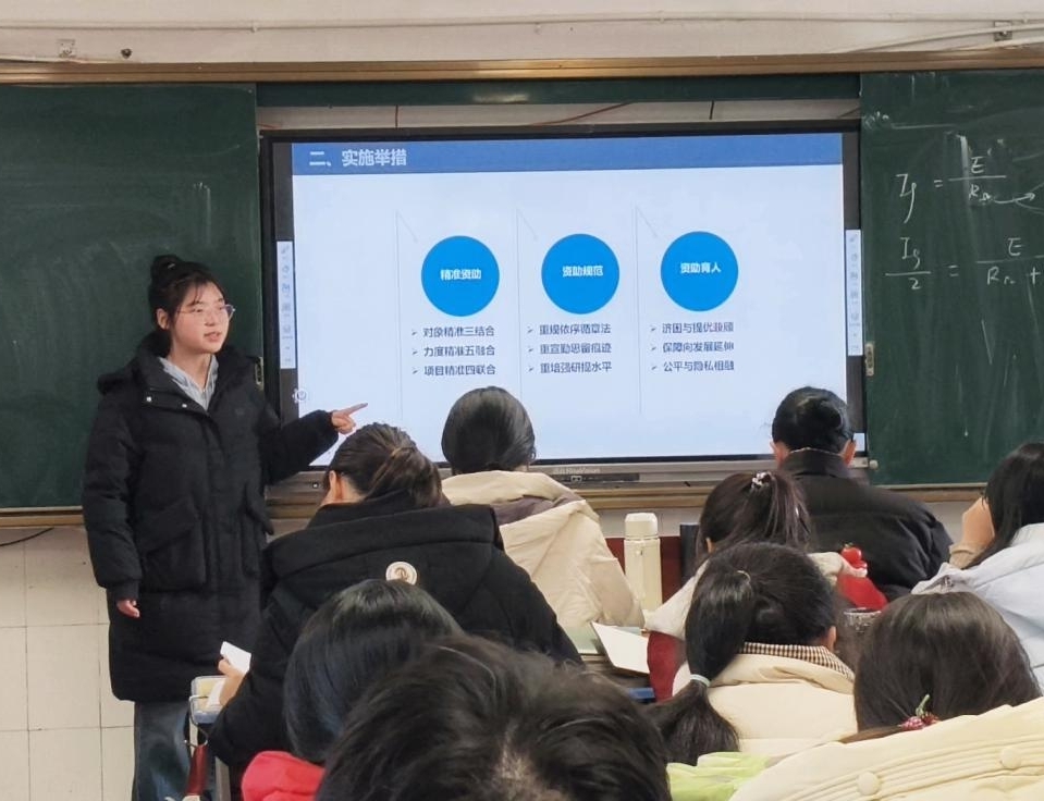 为打通政策宣传“最后一公里”,慈济助学金获得者制药2502班的高丽丽深入开展“精确到户”的宣讲活动。她以“奖、贷、助、补、免、勤、绿”七位一体资助体系为核心,细致讲解政策流程、校内配套保障,同步融入诚信教育与防诈骗宣传。详实的解读让听众彻底打消了经济顾虑,坚定了安心求学的信心。高丽丽也在实践中深切感受到政策的温度,表示将持续传递这份温暖,让更多学子受益。