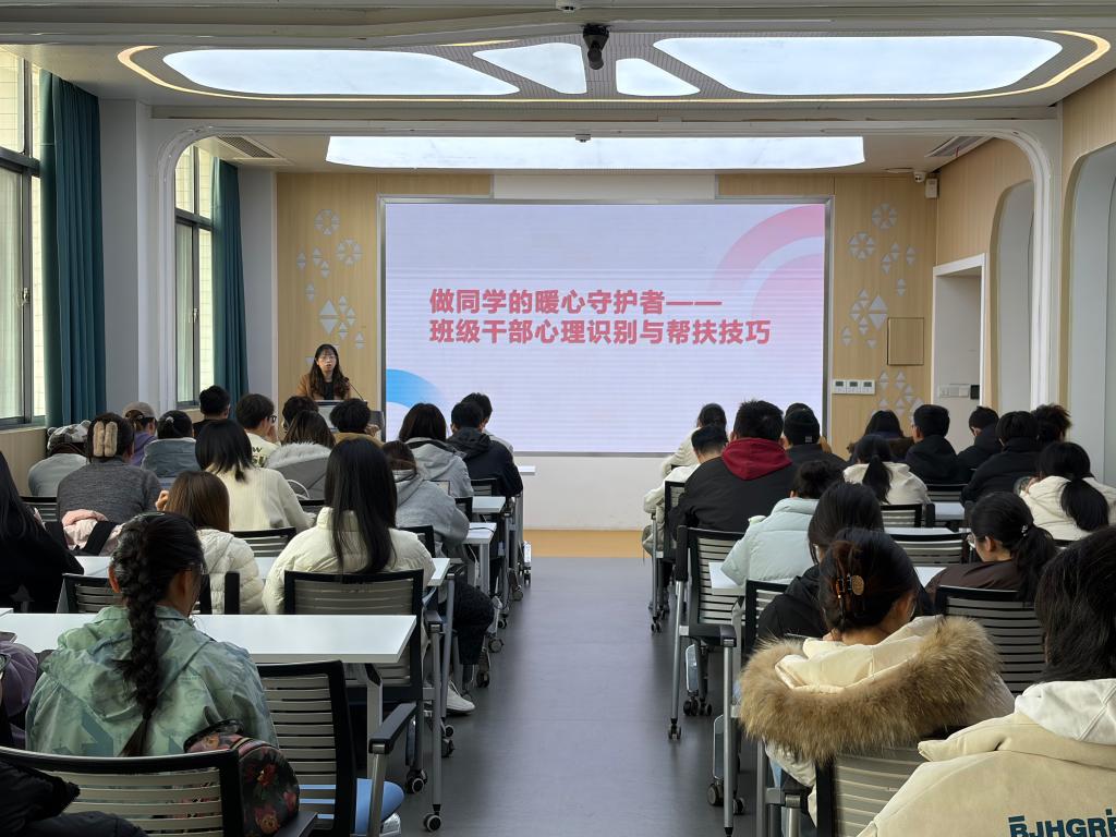 最后,陆冁君围绕心理健康教育,为学生骨干进行分享。她首先分析了大学生在不同阶段可能面临的心理挑战。她详细讲解了如何识别身边同学可能存在心理困扰的信号,包括情绪、行为、认知、生理等方面的异常表现,并传授了沟通技巧,指导学生骨干如何成为同学身边温暖的“心灵守护者”。同时,她还介绍了校内心理咨询的预约方式及校内外丰富的心理服务资源,鼓励大家在需要时积极寻求专业帮助。