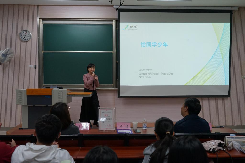 徐洁以当前生物医药领域的热点——ADC药物为切入点,介绍了其精准靶向治疗癌症的技术原理与市场前景。她指出,随着2020年技术突破,ADC行业已进入“黄金赛道”,药明合联作为全球领先的XDC(万物皆可偶联)领域CDMO企业,自2021年成立以来业务规模增长超20倍,员工人数突破2600人,展现了行业高速发展的活力。她鼓励学生关注前沿技术,提前布局职业方向。