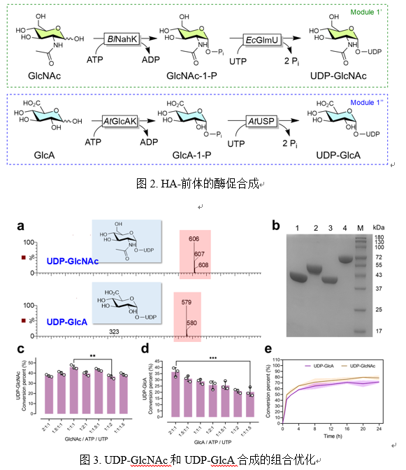论文建立了一种无细胞级联催化系统,利用核苷酸补救途径,从廉价的单糖高效合成UDP-GlcA和UDP-GlcNAc,从而绕过了耗能的从头合成路线;并通过截短多杀巴斯德菌透明质酸合酶(PmHAS)的膜结合相关结构域,实现了其水溶性表达水平及顺序糖基转移酶活性。此外,还实施了ATP/UTP双再生策略以维持核苷酸供应。在优化条件下,该系统在24小时内可合成1.28 g/L的HA,其分子量范围为1.28×10⁴-1.02×10⁶ Da,底物转化率达到65.9%。这项工作不仅为规模化HA合成提供了一个经济平台,也为复杂生物聚合物建立了一个模块化的酶促工程化生产示范,在合成糖生物学领域展示了广泛的应用潜力。